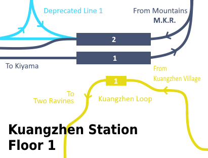 Kuangzhen Station (Chinese: 矿镇站) is a station on the Mountains-Kiyama Railway, Kuangbo Line, Kuangzhen Loop, and the Kuangzhen East-Kuangzhen Connector Line. It is around the 3rd biggest station in the server and is in the Kuangzhen area. It was opened around September 2025. It uses a side platform for the Mountains-Kiyama Railway.